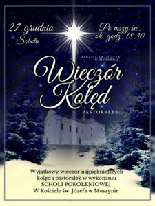 - W sobotę św. Jan Ewangelisty – poświęcenie wina przyniesionego przez was. Po Mszy wieczornej zapraszamy na koncert kolęd w wykonaniu naszej parafialnej „Scholii Pokoleniowej” pod przewodnictwem p. Albina Śliwińskiego.