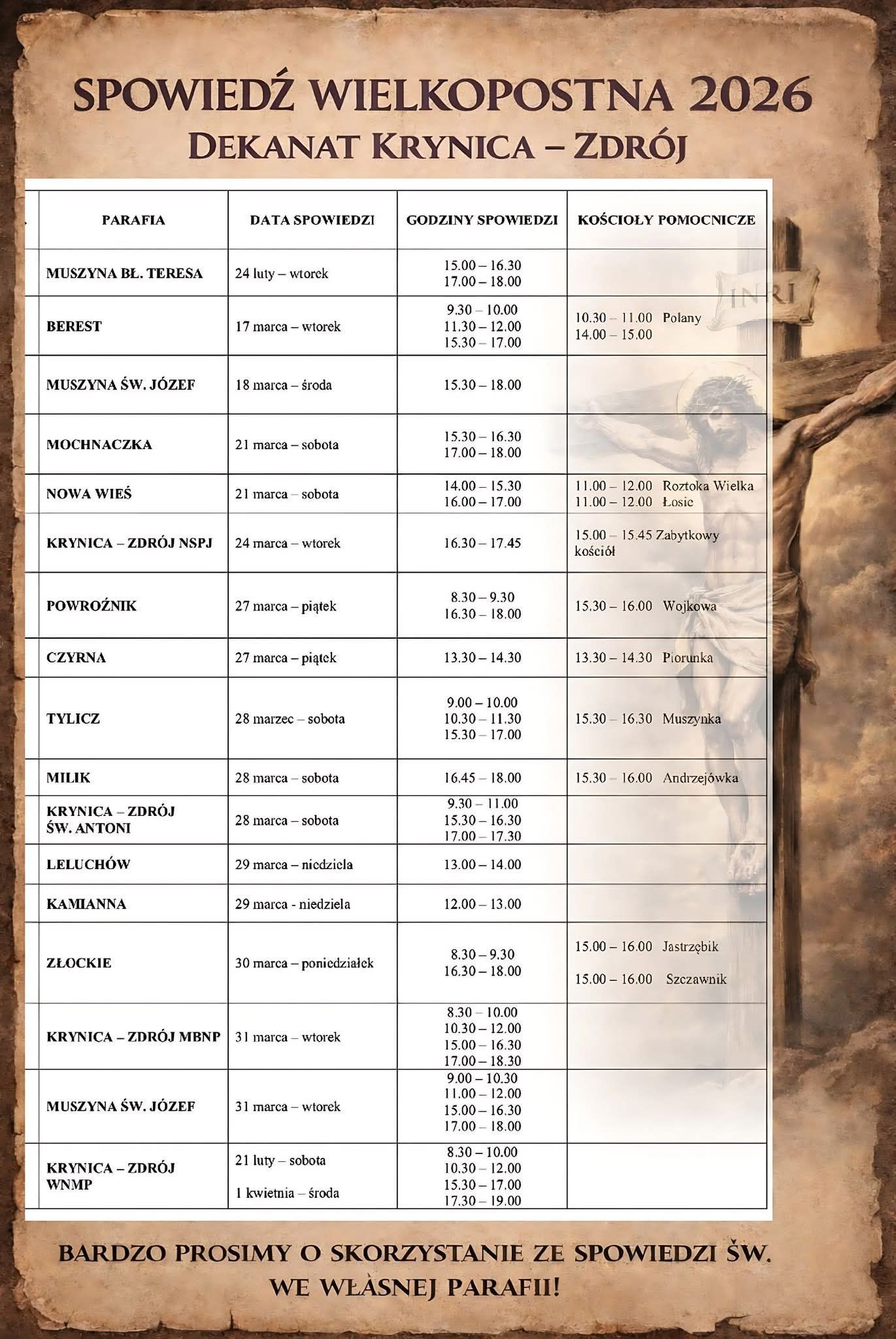 - W najbliższy wtorek odbędzie się spowiedź w naszej parafii. Do południa spowiadać będziemy od godz. 9.00 do 10.00 oraz od 10.30 do 12.00, po południu od 15.00 do 16.00 i od 16.30 do 18.00. Bardzo prosimy o skorzystanie ze spowiedzi w wyznaczonym dniu. Do zgłoszonych chorych udamy się od godz. 8.00.