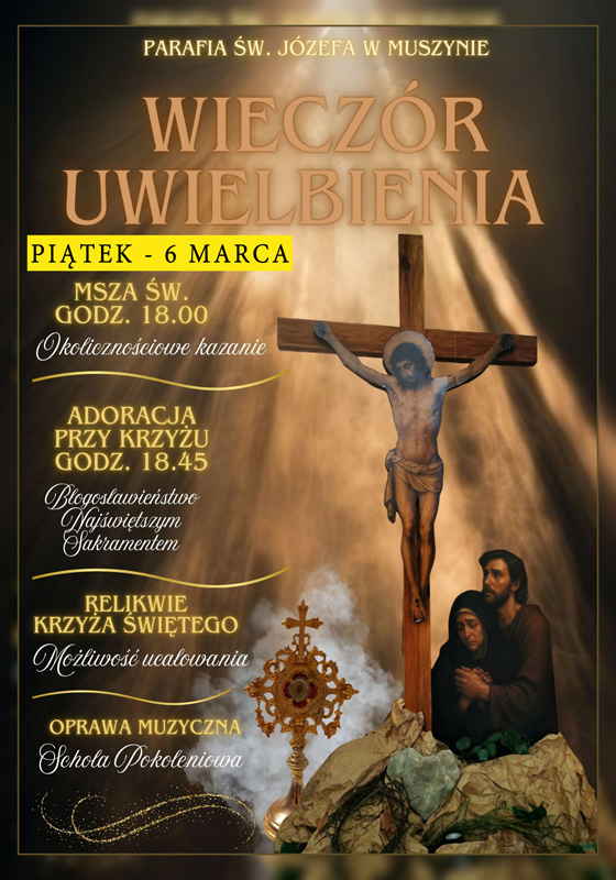 - Dorosłych zapraszamy na Drogę krzyżową o 17.30, po której celebrowana jest Msza św. a po niej Wieczór Uwielbienia Serdecznie zachęcamy wszystkich do licznego udziału.