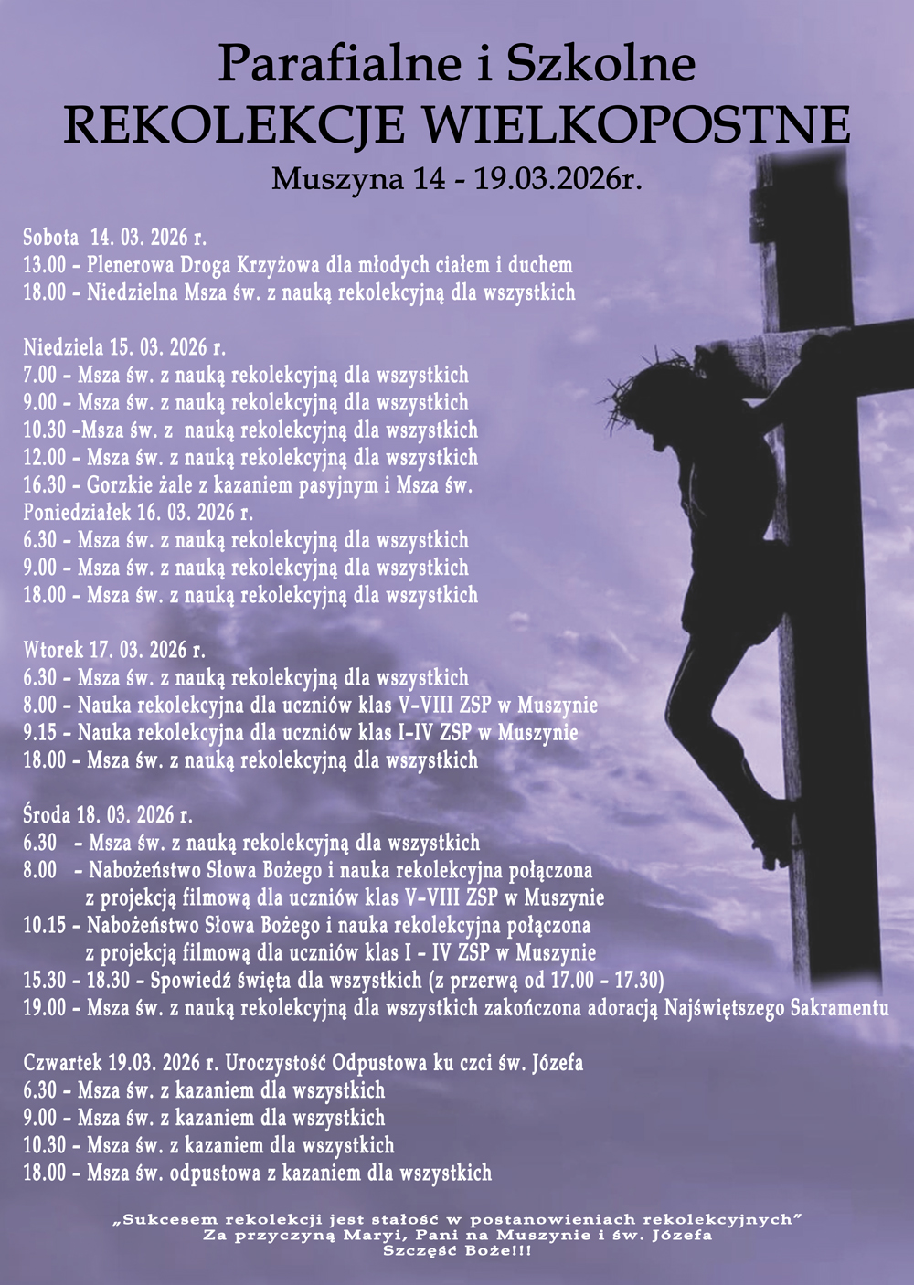 - Z uwagi na to, że 14 marca rozpoczną się nasze parafialne rekolekcje, uległa zmianie data zapowiadanej wcześniej Młodzieżowej Drogi Krzyżowej. Odbędzie się ona w sobotę 14 marca o godz. 13.00. O szczegółach poinformujemy w przyszłym tygodniu.